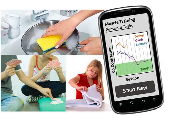Advances in sensor technology and ubiquitous sensing have created new pathways to understand and monitor human activity during daily life – facilitating movement practice in the home and community. The objective of this research is to develop the technology to enable ubiquitous rehabilitation – rehabilitation that harnesses activities of daily life to monitor, train, and improve movement. Specifically, we seek to design, develop, and evaluate novel approaches for tracking and training muscle activity to improve upper extremity function after neurologic injury.