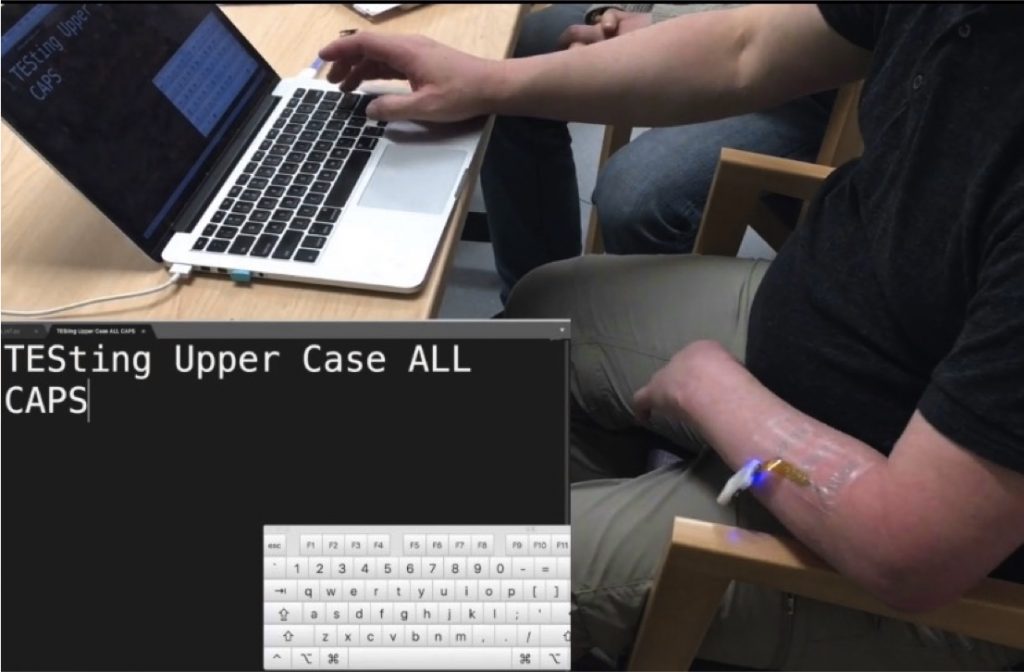 One of our co-designers requested using the EMG electrodes to control the shift key on his computer. Now he can use the interface to both make typing easier and practice activating his forearm muscles while he is at work.