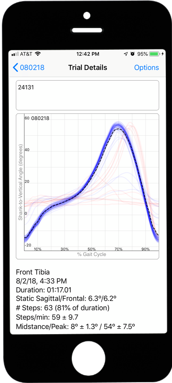 Shank-to-vertical angle (SVA) is used by orthotists and therapists to improve walking function. We developed and tested a mobile app that lets users monitor (SVA) during standing or walking using an Android or iOS smartphone. Using a running armband or other strap, you attach your phone to the shank and the app automatically calculates SVA over the gait cycle. Raw data or summary plots can be exported from the app to your e-mail or other services. Please see our publication for full details and to download the app.