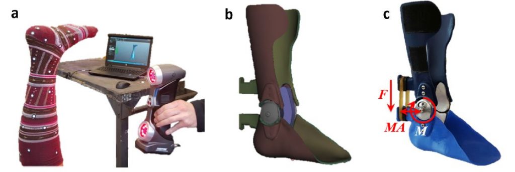 Hwan Choi designed a 3D-printed adjustable-stiffness that can be tuned with different sizes of elastic polymer bands. This AFO was used for evaluating how different dorsiflexion resistance impacts musculotendon function and walking pattern using ultrasound, musculoskeletal modeling (OpenSim) and a motion capture system.