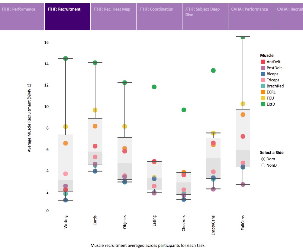 Tests such as the Jebsen Taylor Hand Function Test and the Chedoke Arm and Hand Assessment Inventory are commonly used in the clinic to evaluate hand function after neurologic injury. These tests include a variety of tasks of daily living that help clinicians evaluate function and guide treatment. To help understand how unimpaired individuals recruit and coordinate their muscles to execute these tasks, Keshia Peters evaluated EMG recordings for 20 individuals during these tasks. The Tableau interactive graphic lets you dive into the data and see how we use the complexities of the ultimate machine to perform everyday tasks. Please see our journal article for full details on this study.
